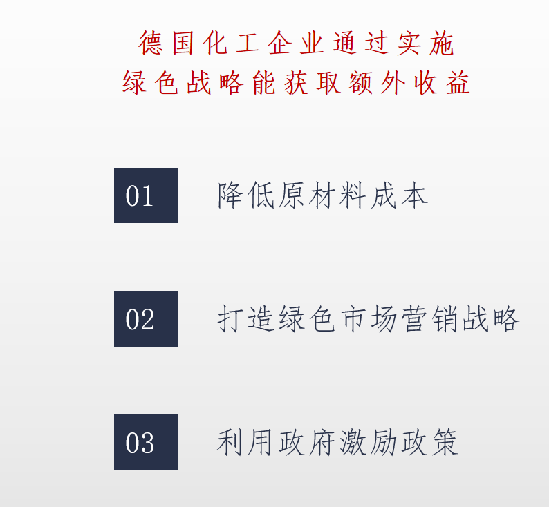 德国化工企业通过实施绿色战略能获取额外收益,主要来自降低原材料成本、打造绿色市场营销战略和利用政府激励政策。