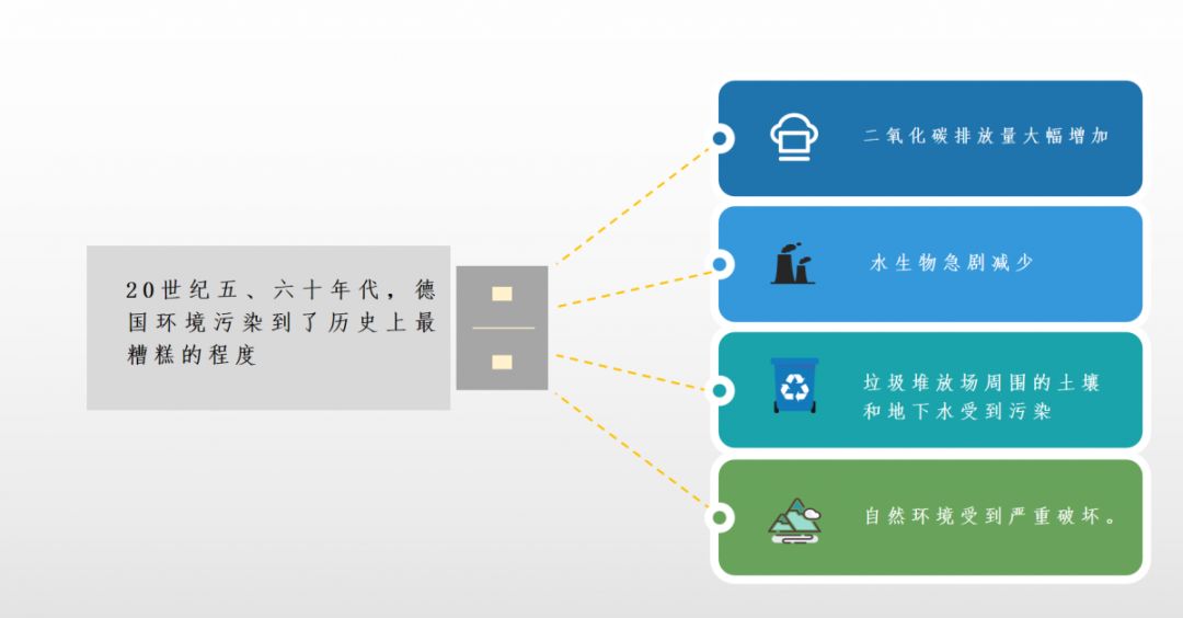 20世纪60年代中期,拜耳排放的工业污染物导致附近居民的汽车掉漆,拜耳为此支付了高达100万德国马克的赔偿,促使企业开始重视环保问题。不断恶化的环境使政府、企业和民众不再单纯关注就业、经济增长和收入水平,而是愈发重视环境保护和生活质量,环境污染成为亟待解决的迫切问题,环保意识逐步觉醒。